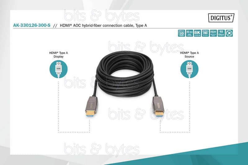 This active HDMI AOC (Active Optical Cable) Hybrid Fiber Optic Cable is ideally suited for transferring uncompressed video and audio data with high bandwidth over longer distances. The hybrid construction, which uses copper and fiber optic cable, prevents electromagnetic interference. This ensures a loss-free transfer along the entire length of the cable with a UHD resolution of up to 8K/60Hz and bandwidths of up to 48 Gbps.