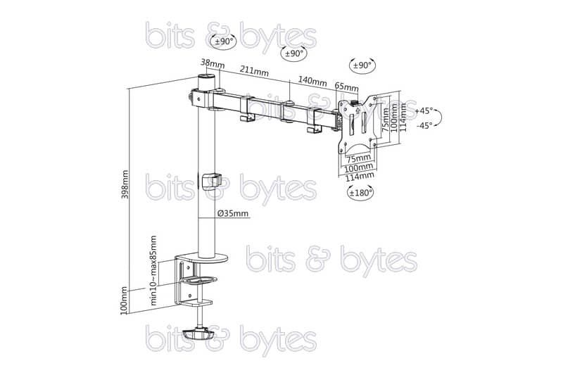 - Rotation of the VESA bracket / swivel arm: 270° (3 hinges with 90° each)
