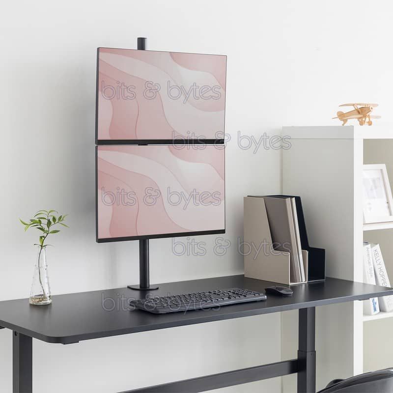 The desktop mount allows you to mount two monitors of up to 32" / 8 kg vertically, one above the other. Swivelling, rotating as well as tilting of the monitors is made possible by the mount. The quick-release function enables rapid attachment or removal of monitors The mount offers two mounting options: both table clamp and pass-through rod are included in the scope of delivery.