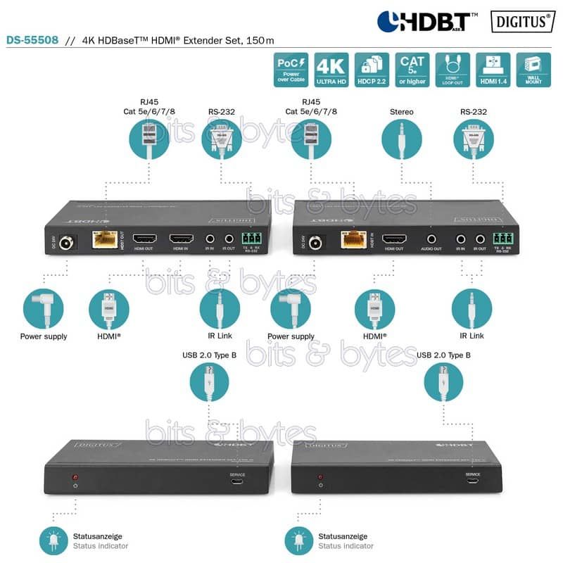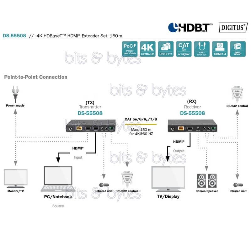 Digitus DS-55508 4K HDBaseT HDMI Extender Set over CAT6a or CAT7 with IR Function (up to 150 meters)